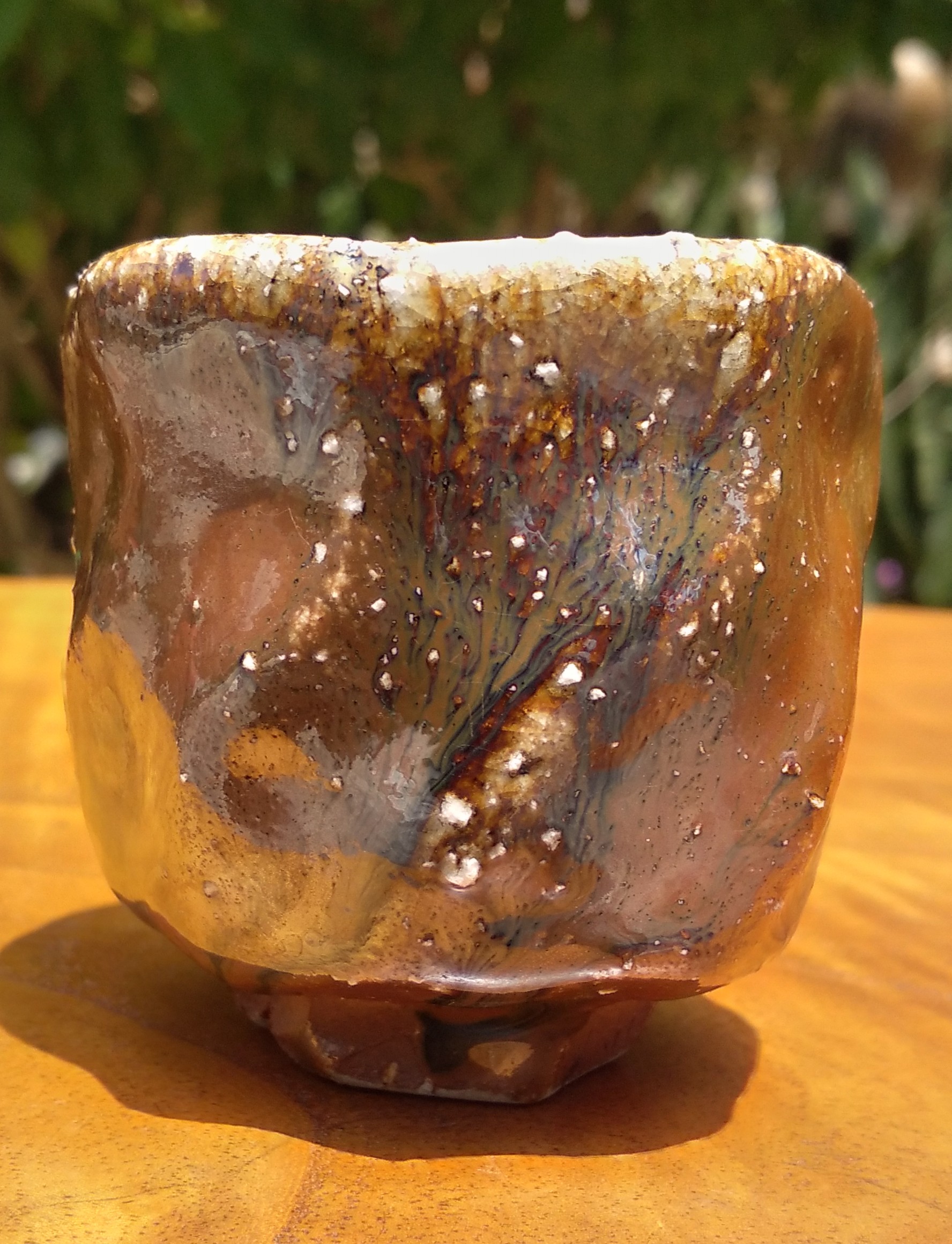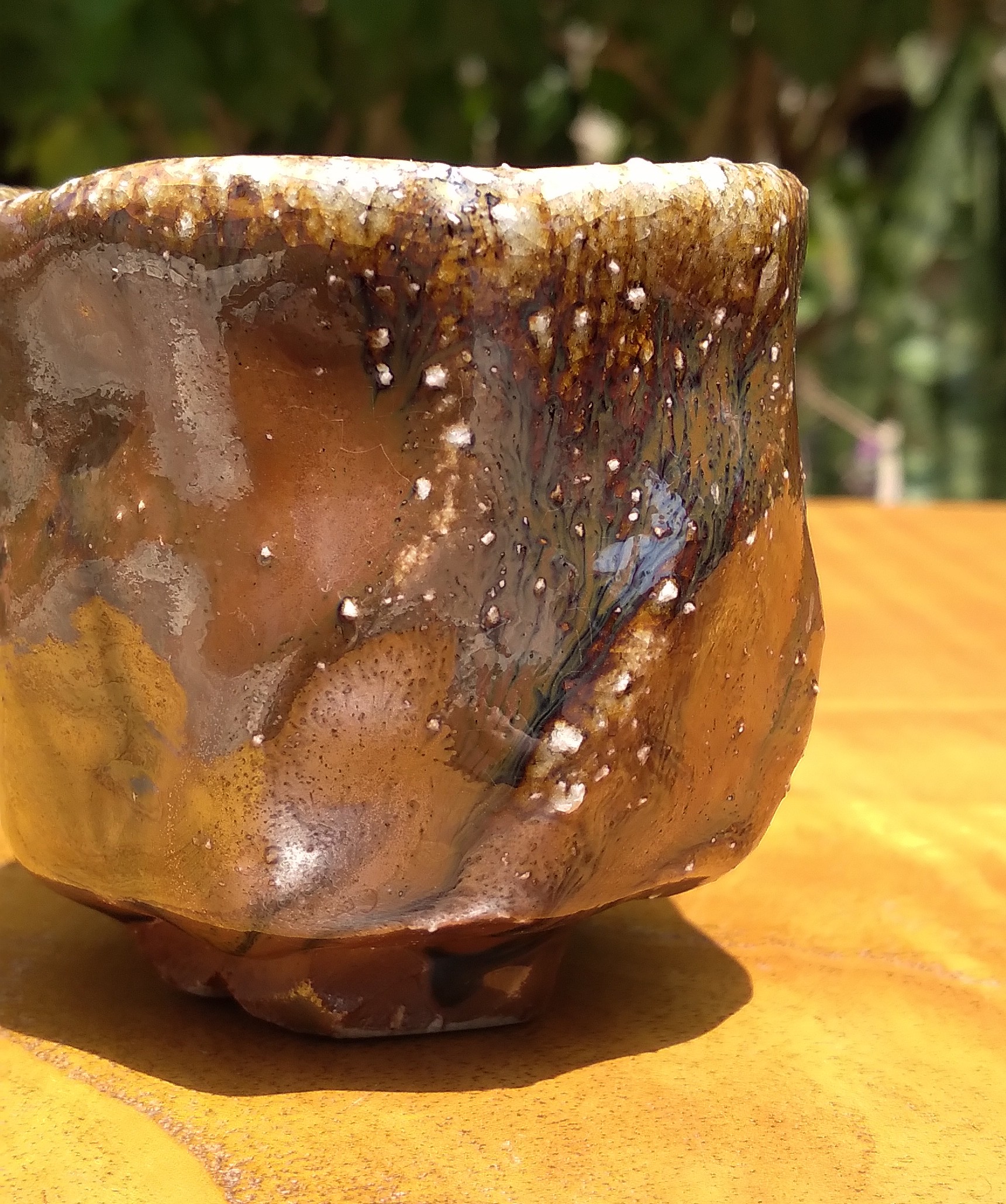 可見自然釉隨杯子紋路流下,顏色多變,白、綠、咖、藍自然交織出的層次美學